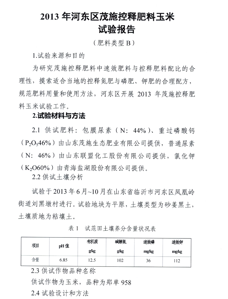 2013年河东区茂施控释肥料玉米试验报告